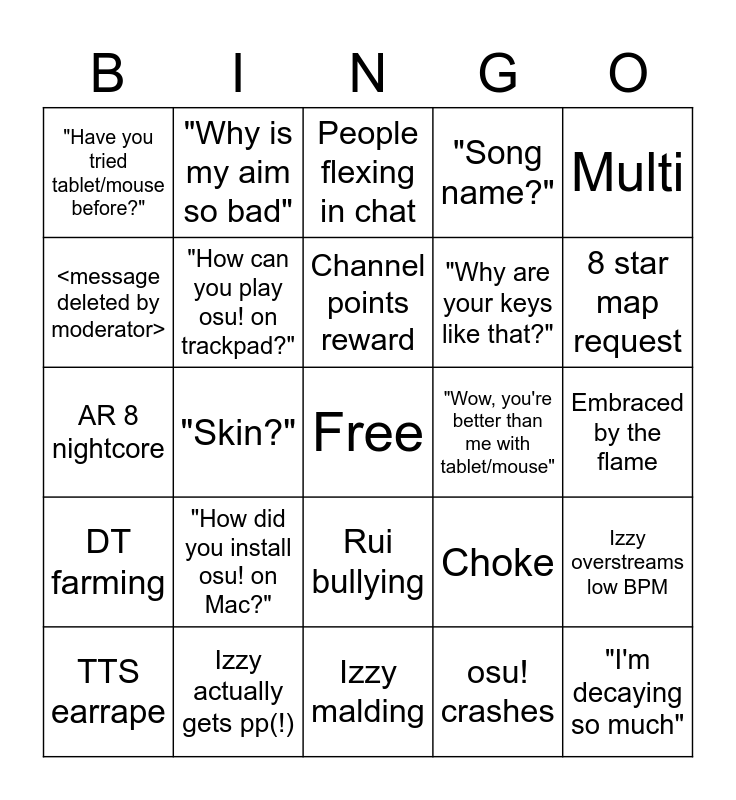 This bingo card has a free space and 24 words: "How did you install osu! on Mac?", Izzy actually gets pp(!), Channel points reward, TTS earrape, Multi, "Have you tried tablet/mouse before?", <message deleted by moderator>, "Why is my aim so bad", "Wow, you're better than me with tablet/mouse", Rui bullying, "Why are your keys like that?", AR 8 nightcore, Choke, Izzy overstreams low BPM, "How can you play osu! on trackpad?", osu! crashes, Embraced by the flame, People flexing in chat, 8 star map request, "Skin?", "I'm decaying so much", DT farming, "Song name?" and Izzy malding.