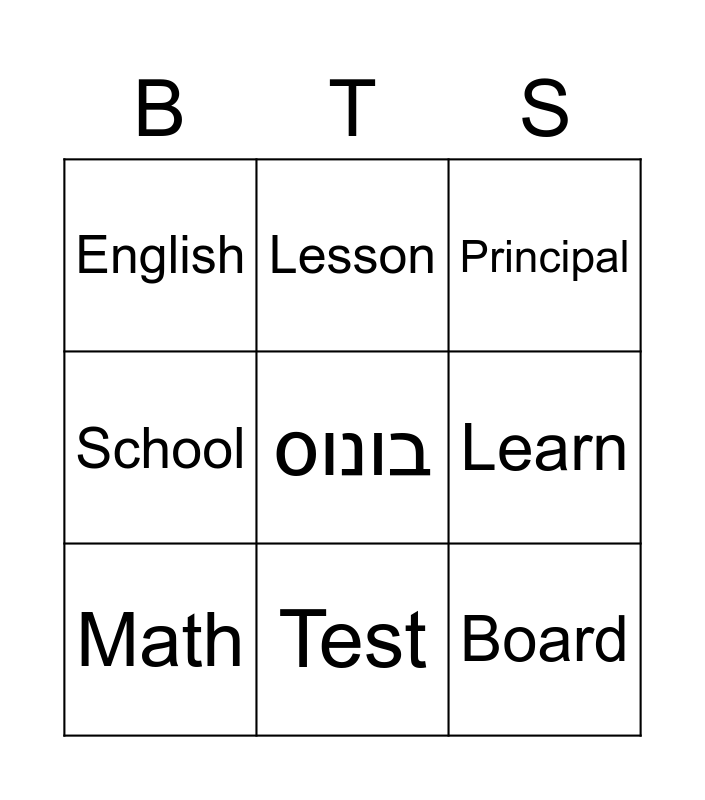 This bingo card has a free space and 8 words: Learn, Principal, Lesson, Math, English, Board, School and Test.