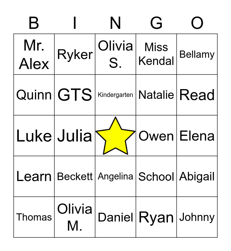 This bingo card has a free space and 24 words: Beckett, Olivia M., Kindergarten, Thomas, Bellamy, Mr. Alex, Quinn, Ryker, Owen, Angelina, Natalie, Luke, School, Abigail, GTS, Ryan, Elena, Olivia S., Read, Julia, Johnny, Learn, Miss Kendal and Daniel.