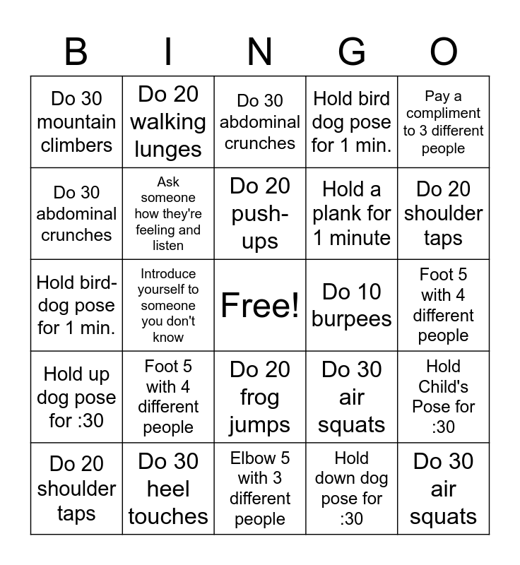 This bingo card has a free space and 24 words: Foot 5 with 4 different people, Do 30 heel touches, Do 20 push-ups, Do 20 shoulder taps, Pay a compliment to 3 different people, Do 30 mountain climbers, Do 30 abdominal crunches, Do 20 walking lunges, Do 10 burpees, Do 20 frog jumps, Hold a plank for 1 minute, Hold bird-dog pose for 1 min., Do 30 air squats, Hold Child's Pose for :30, Ask someone how they're feeling and listen, Hold down dog pose for :30, Foot 5 with 4 different people, Do 30 abdominal crunches, Do 20 shoulder taps, Introduce yourself to someone you don't know, Do 30 air squats, Hold up dog pose for :30, Hold bird dog pose for 1 min. and Elbow 5 with 3 different people.