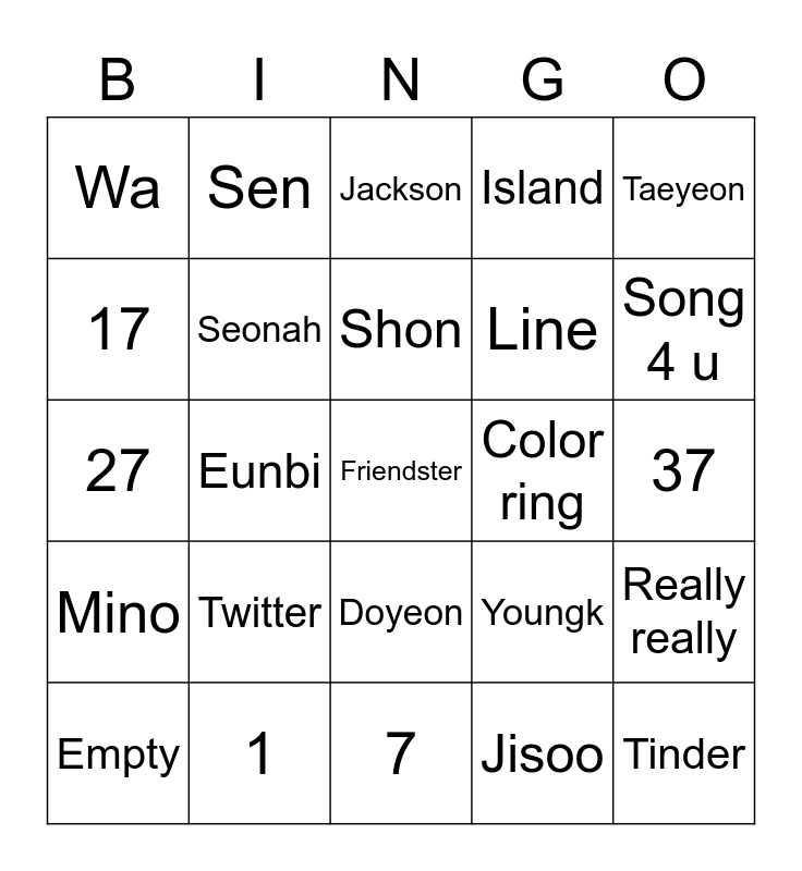 This bingo card has 25 words: Twitter, 7, Shon, Empty, Taeyeon, Wa, 17, Sen, Color ring, Doyeon, Line, 27, Youngk, Really really, Seonah, Tinder, 37, Jackson, Song 4 u, Eunbi, Friendster, 1, Mino, Island and Jisoo.
