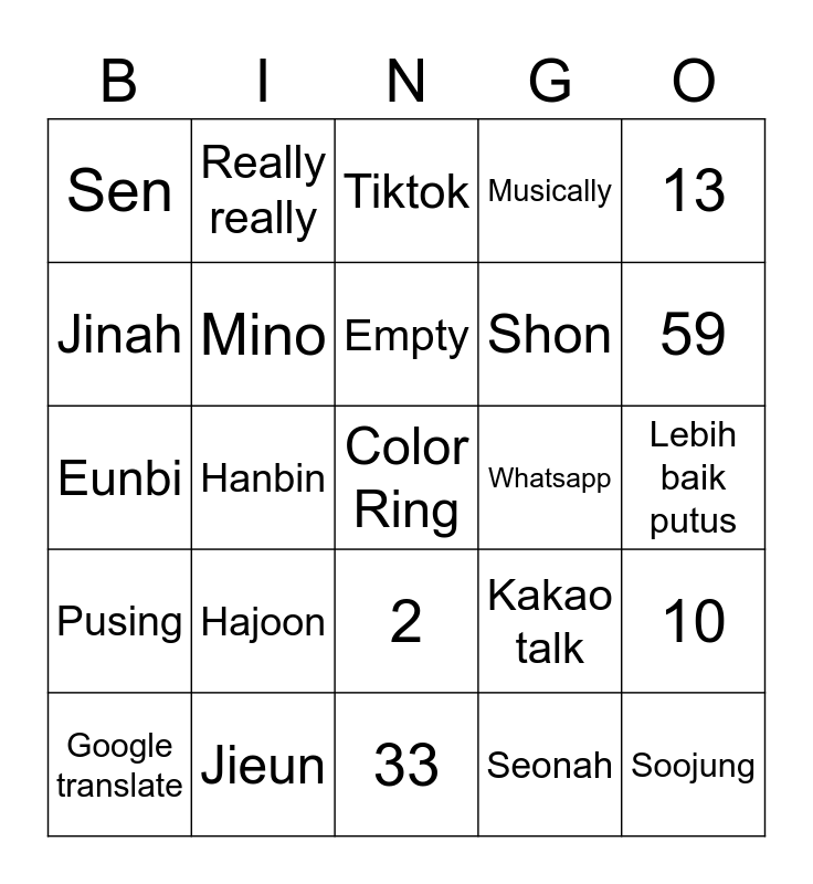 This bingo card has a free space and 24 words: Hajoon, Jieun, Empty, Google translate, 13, Sen, Jinah, Really really, Whatsapp, 2, Shon, Eunbi, Kakao talk, 10, Mino, Seonah, Lebih baik putus, Tiktok, 59, Hanbin, Soojung, Pusing, Musically and 33.