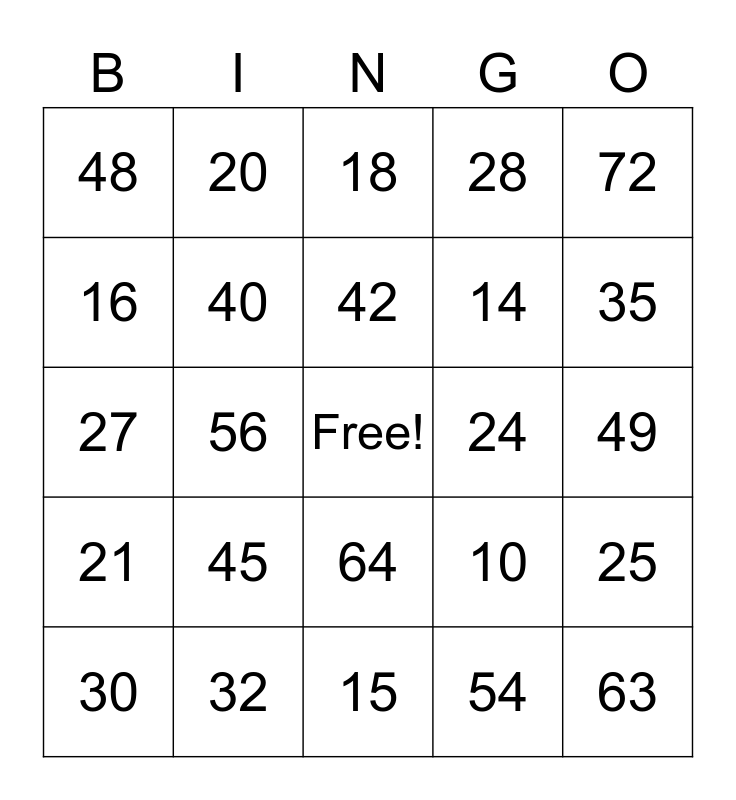 This bingo card has a free space and 27 words: 10, 12, 14, 15, 16, 18, 20, 21, 24, 25, 27, 28, 30, 32, 35, 36, 40, 42, 45, 48, 49, 54, 56, 63, 64, 72 and 81.