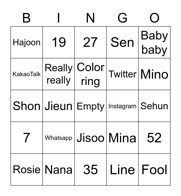 This bingo card has a free space and 24 words: Whatsapp, Nana, Color ring, Rosie, Baby baby, Hajoon, KakaoTalk, 19, Instagram, Jisoo, Twitter, Shon, Mina, 52, Really really, Line, Sehun, 27, Mino, Jieun, Fool, 7, Sen and 35.