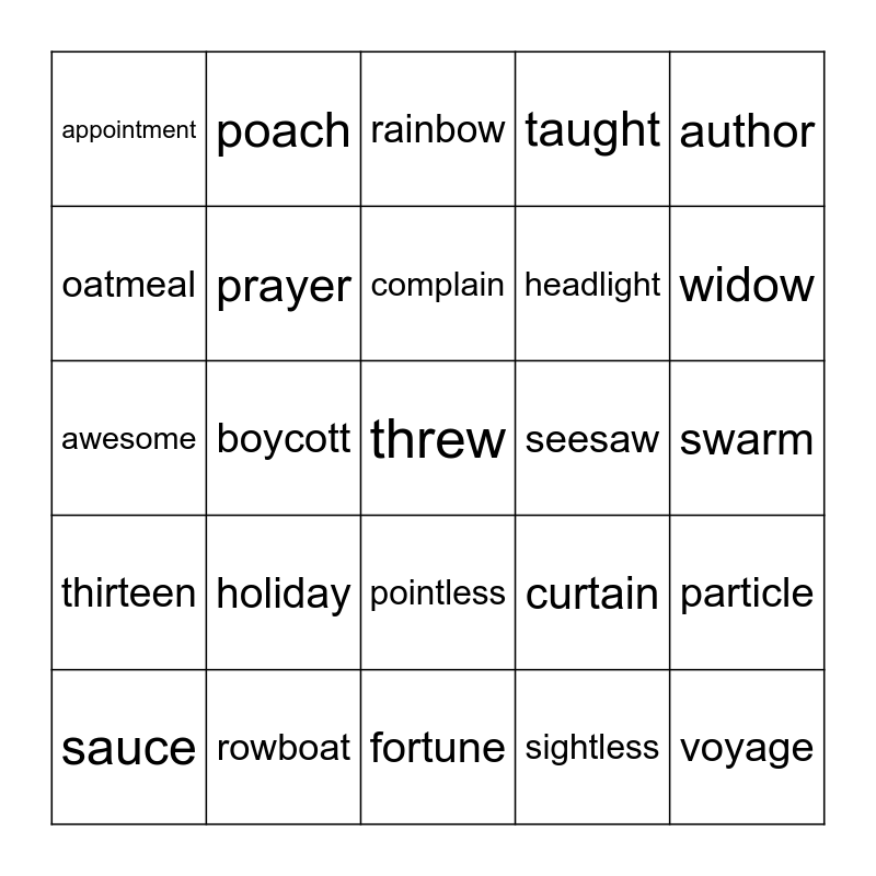 This bingo card has a free space and 28 words: particle, absentee, headlight, sightless, oatmeal, rainbow, poach, thirteen, seesaw, sauce, awesome, taught, rowboat, fortune, widow, highway, holiday, prayer, complain, pointless, appointment, destroy, voyage, boycott, swarm, curtain, author and caterpillar.