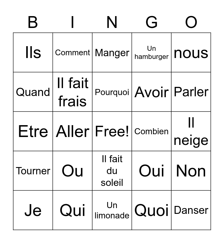 This bingo card has a free space and 24 words: Ou, Qui, Pourquoi, Je, nous, Ils, Quand, Comment, Combien, Il fait du soleil, Avoir, Etre, Oui, Non, Il fait frais, Quoi, Il neige, Manger, Parler, Aller, Danser, Tourner, Un hamburger and Un limonade.