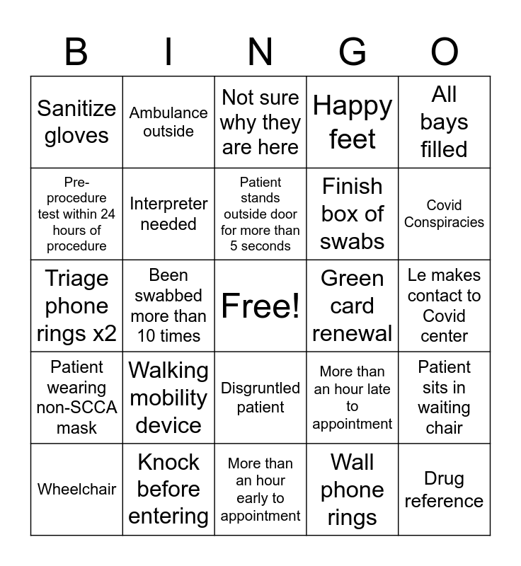 This bingo card has a free space and 29 words: Wheelchair, Staff/Caregiver, Been swabbed more than 10 times, Fever, Sanitize gloves, Not sure why they are here, Interpreter needed, Walking mobility device, Green card renewal, Knock before entering, Le makes contact to Covid center, Drug reference, More than an hour early to appointment, Wall phone rings, Covid Conspiracies, Patient screams, Disgruntled patient, Patient wearing non-SCCA mask, All bays filled, Triage phone rings x2, More than an hour late to appointment, Fun Box!, Finish box of swabs, Pre-procedure test within 24 hours of procedure, Happy feet, Ambulance outside, Patient sits in waiting chair, Patient stands outside door for more than 5 seconds and Defer patient.