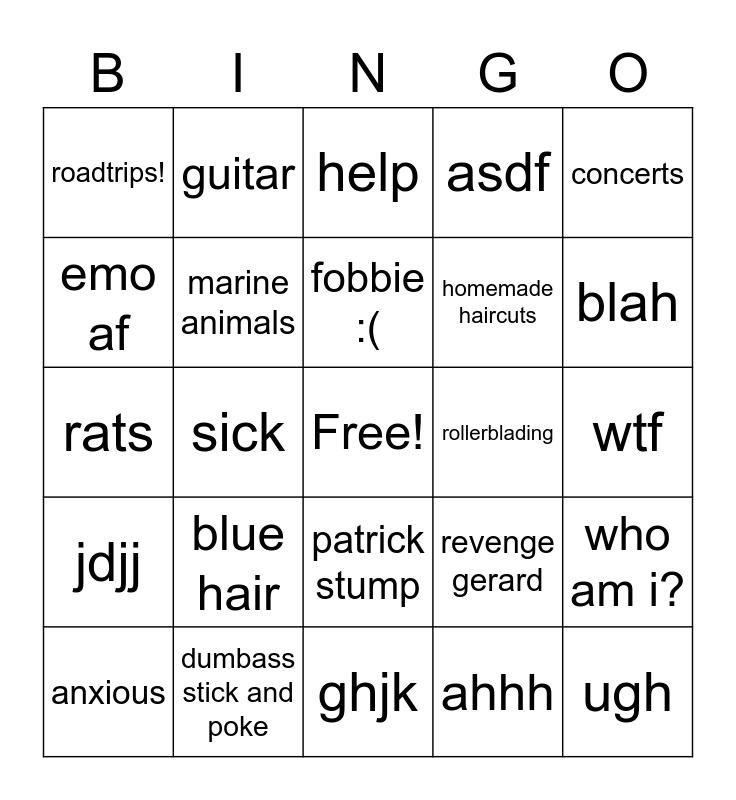This bingo card has a free space and 24 words: blue hair, dumbass stick and poke, fobbie :(, anxious, concerts, roadtrips!, emo af, guitar, rollerblading, patrick stump, homemade haircuts, rats, revenge gerard, who am i?, marine animals, ahhh, wtf, help, blah, sick, ugh, jdjj, asdf and ghjk.