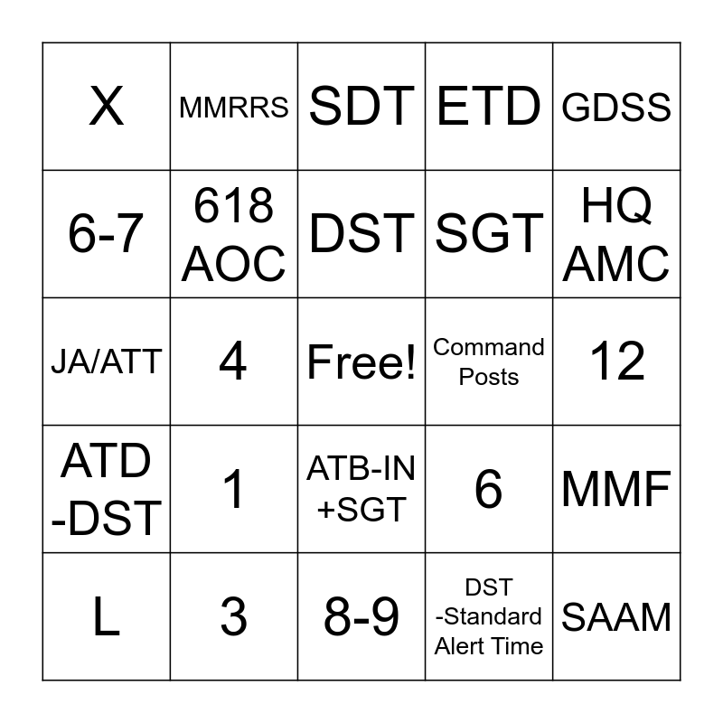 This bingo card has a free space and 24 words: 1, 3, DST, L, GDSS, X, 6-7, MMRRS, Command Posts, ATB-IN +SGT, SGT, JA/ATT, 6, MMF, 618 AOC, DST -Standard Alert Time, 12, SDT, HQ AMC, 4, SAAM, ATD -DST, ETD and 8-9.