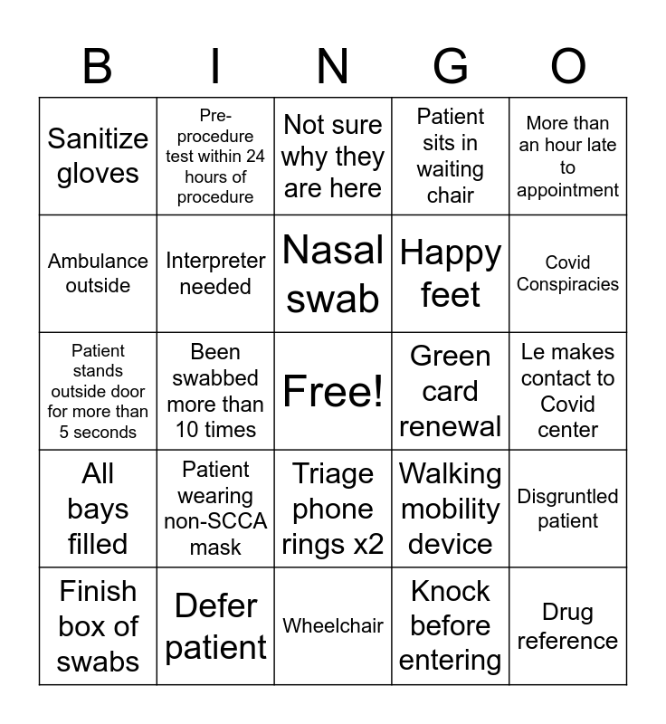 This bingo card has a free space and 31 words: Wheelchair, Staff/Caregiver, Been swabbed more than 10 times, Fever, Sanitize gloves, Not sure why they are here, Interpreter needed, Walking mobility device, Green card renewal, Knock before entering, Le makes contact to Covid center, Drug reference, More than an hour early to appointment, Wall phone rings, Covid Conspiracies, Patient screams, Disgruntled patient, Patient wearing non-SCCA mask, All bays filled, Triage phone rings x2, More than an hour late to appointment, Fun Box!, Finish box of swabs, Pre-procedure test within 24 hours of procedure, Happy feet, Ambulance outside, Patient sits in waiting chair, Patient stands outside door for more than 5 seconds, Defer patient, Nasal swab and Patient bypasses TC.