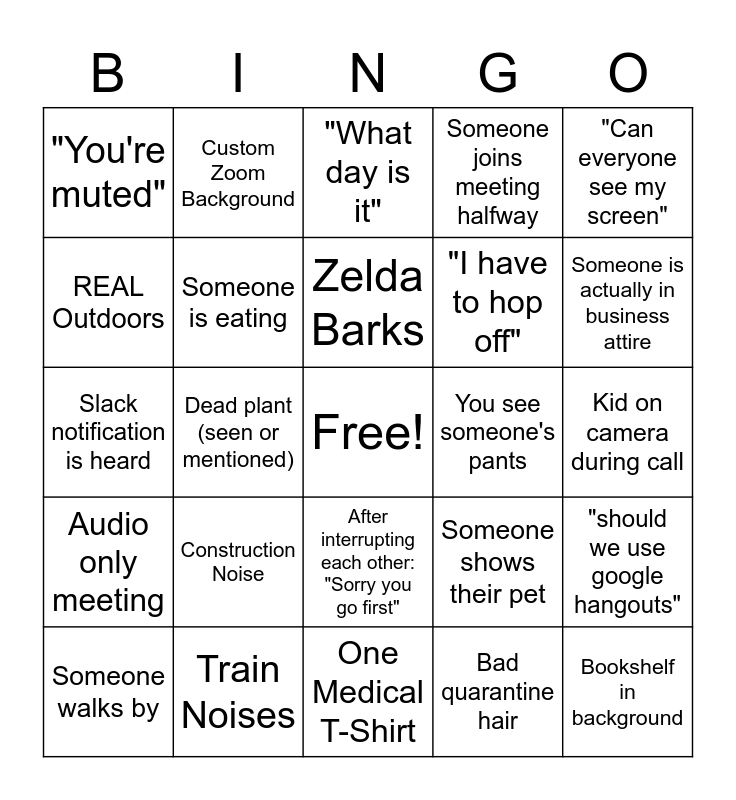 This bingo card has a free space and 24 words: Construction Noise, Train Noises, Zelda Barks, Someone walks by, "Can everyone see my screen", "You're muted", REAL Outdoors, Custom Zoom Background, You see someone's pants, After interrupting each other: "Sorry you go first", "I have to hop off", Slack notification is heard, Someone shows their pet, "should we use google hangouts", Someone is eating, Bad quarantine hair, Kid on camera during call, "What day is it", Someone is actually in business attire, Dead plant (seen or mentioned), Bookshelf in background, Audio only meeting, Someone joins meeting halfway and One Medical T-Shirt.