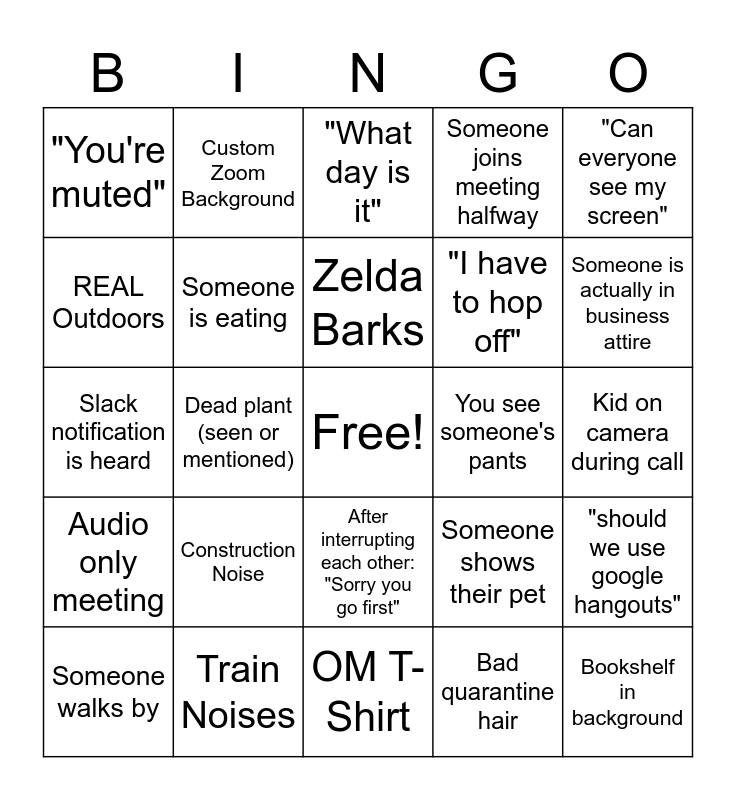 This bingo card has a free space and 24 words: Construction Noise, Train Noises, Zelda Barks, Someone walks by, "Can everyone see my screen", "You're muted", REAL Outdoors, Custom Zoom Background, You see someone's pants, After interrupting each other: "Sorry you go first", "I have to hop off", Slack notification is heard, Someone shows their pet, "should we use google hangouts", Someone is eating, Bad quarantine hair, Kid on camera during call, "What day is it", Someone is actually in business attire, Dead plant (seen or mentioned), Bookshelf in background, Audio only meeting, Someone joins meeting halfway and OM T-Shirt.