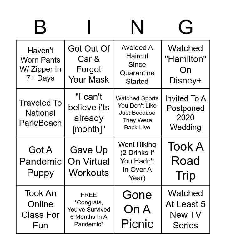 This bingo card has 24 words: Thought We'd Be Back In Office By Now, Forgotten What Day It Is, Invited To A Postponed 2020 Wedding, Cancelled Your 2020 Vacation Plans, Traveled To National Park/Beach, Haven't Worn Pants W/ Zipper In 7+ Days, "I can't believe i'ts already [month]", Got Out Of Car & Forgot Your Mask, FREE *Congrats, You've Survived 6 Months In A Pandemic*, Already Drank A PSL or Decorated For Fall, Got A Pandemic Puppy, Went Hiking (2 Drinks If You Hadn't In Over A Year), Still Baking Homemade Bread, Downloaded Tik Tok, Watched Sports You Don't Like Just Because They Were Back Live, Gone To A Drive-In Movie Theater, Gone On A Picnic, Avoided A Haircut Since Quarantine Started, Gave Up On Virtual Workouts, Took A Road Trip, Took An Online Class For Fun, Watched At Least 5 New TV Series, Watched "Hamilton" On Disney+ and Created A Real WFH Space.