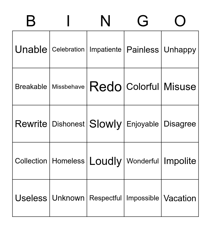 This bingo card has a free space and 24 words: Homeless, Unknown, Redo, Useless, Unhappy, Unable, Breakable, Celebration, Enjoyable, Loudly, Colorful, Rewrite, Wonderful, Impolite, Missbehave, Impossible, Disagree, Impatiente, Misuse, Dishonest, Vacation, Collection, Painless and Respectful.