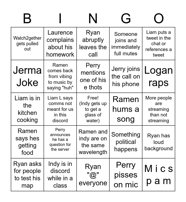 This bingo card has a free space and 34 words: Ryan makes random loud noise, Perry pisses on mic, Liams headset dies, Indr speaks in twitch speak, Ramen says hes getting food, Ramen comes back from vibing to music by saying "huh", Liam puts a tweet in the chat or references a tweet, Ryan asks for people to test his map, Laurence complains about his homework, Liam Lord pitches minecraft to the boys, Perry mentions one of his e thots, Ryan abruptly leaves the call, Logan gets mad at someone for not playing a certaing game, Laurence comes in the call a few beers deep, Ramen hums a song, Logan raps, Indy is in discord while in a class, Liam is in the kitchen cooking, Perry announces he has a question for the server, Something political happens, Ramen and indy are on the same wavelength, "Is ____ here?", Watch2gether gets pulled out, More people are streaming than not streaming, Ryan "@" everyone, M i c s p a m, Someone joins and immediately full mutes, Jerry eats on mic, Jerry joins the call on his phone, Jerma Joke, Jeremiah dominates stream, Liam L says comms not meant for us in this discord, Ryan has loud background and Free (Ryan keyboard on mic.