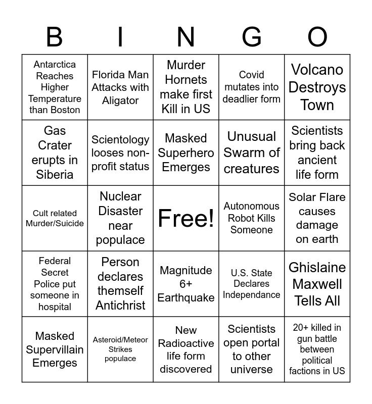 This bingo card has a free space and 24 words: Person declares themself Antichrist, Asteroid/Meteor Strikes populace, Masked Superhero Emerges, Masked Supervillain Emerges, Volcano Destroys Town, Antarctica Reaches Higher Temperature than Boston, Gas Crater erupts in Siberia, Florida Man Attacks with Aligator, Autonomous Robot Kills Someone, Magnitude 6+ Earthquake, Unusual Swarm of creatures, Cult related Murder/Suicide, U.S. State Declares Independance, Ghislaine Maxwell Tells All, Scientology looses non-profit status, Scientists open portal to other universe, Solar Flare causes damage on earth, Murder Hornets make first Kill in US, Scientists bring back ancient life form, Nuclear Disaster near populace, 20+ killed in gun battle between political factions in US, Federal Secret Police put someone in hospital, Covid mutates into deadlier form and New Radioactive life form discovered.