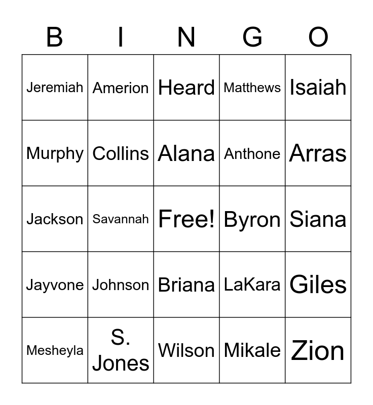 This bingo card has a free space and 32 words: Mikale, Calhoun, Savannah, Coleman, Jayvone, Collins, Isaiah, Giles, Amerion, Harris, Alana, Heard, Anira, A. Hibbler, Byron, B. Hibbler, Mesheyla, Jackson, Briana, Johnson, LaKara, L. Jones, Siana, S. Jones, Zion, Matthews, Anthone, Murphy, Jeremiah, Wilson, Kristin and Arras.