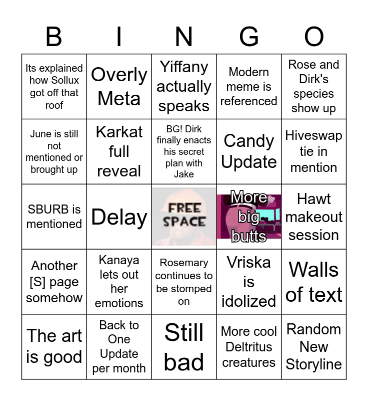 This bingo card has 2 images, a free space and 24 words: The art is good, Kanaya lets out her emotions, BG! Dirk finally enacts his secret plan with Jake, More cool Deltritus creatures, Hiveswap tie in mention, Its explained how Sollux got off that roof, Overly Meta, Yiffany actually speaks, Candy Update, Walls of text, SBURB is mentioned, Karkat full reveal, Vriska is idolized, Random New Storyline, June is still not mentioned or brought up, Back to One Update per month, Still bad, Modern meme is referenced, Hawt makeout session, Another [S] page somehow, Delay, Rosemary continues to be stomped on, More big butts and Rose and Dirk's species show up.