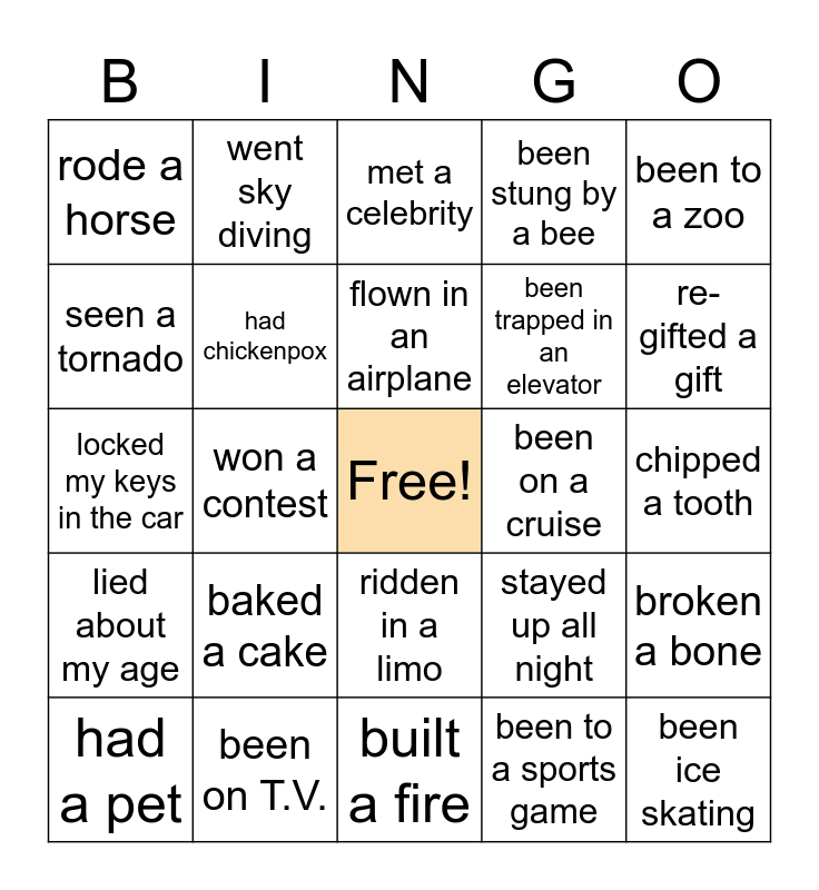 This bingo card has a free space and 24 words: baked a cake, been on T.V., flown in an airplane, had a pet, been to a zoo, rode a horse, seen a tornado, went sky diving, been on a cruise, ridden in a limo, been trapped in an elevator, locked my keys in the car, stayed up all night, broken a bone, had chickenpox, been to a sports game, chipped a tooth, met a celebrity, re-gifted a gift, won a contest, been ice skating, lied about my age, been stung by a bee and built a fire.