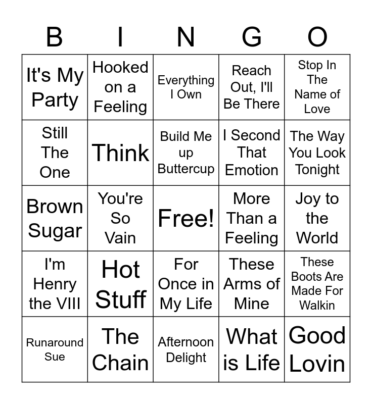 This bingo card has a free space and 40 words: Da Doo Ron Ron, Brown Sugar, Runaway, Think, The Chain, For Once in My Life, Build Me up Buttercup, Daydream Believer, Stop In The Name of Love, I'm Henry the VIII, You're So Vain, Reach Out, I'll Be There, Good Lovin, Joy to the World, More Than a Feeling, Hot Stuff, What's New Pussycat, It's My Party, Good Vibrations, Everything I Own, These Boots Are Made For Walkin, What is Life, I Second That Emotion, Still The One, Mrs Robinson, Heard it thru The Grapevine, Brown Eyed Girl, What a Wonderful World, I Wanna be your Lover, I want you Back, Be My Baby, Runaround Sue, I'll Be Around, These Arms of Mine, The Way You Look Tonight, Afternoon Delight, Let's Twist Again, I Can See Clearly, Hooked on a Feeling and Twistin the Night Away.