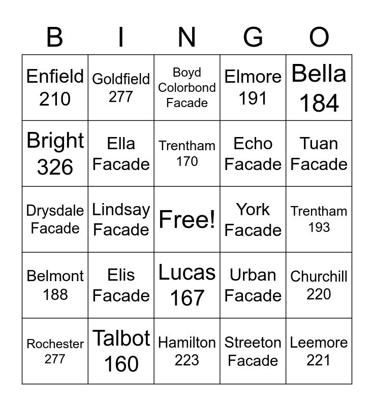 This bingo card has 41 words: Bromley 152, Drysdale Facade, Condor Facade, Ella Facade, Talbot 160, Lucas 167, Trentham 170, Winton 170, Bella 184, Belmont 188, Lindsay Facade, Elmore 191, Free!, Trentham 193, York Facade, Elis Facade, Romsley 210, Enfield 210, Mernda 218, Boyd Colorbond Facade, Churchill 220, Leemore 221, Hamilton 223, Echo Facade, Boyd Timber Facade, Johanna 240 Retreat, Streeton Facade, Valerie Facade, Tuan Facade, Mansfield 256, Lexi Facade, Goldfield 277, Rochester 277, Stanley 284, Urban Facade, Bright 326, Vista Timber Facade, Brooklyn Facade, Metro Facade, Balmoral 355 and Ibiza 407.