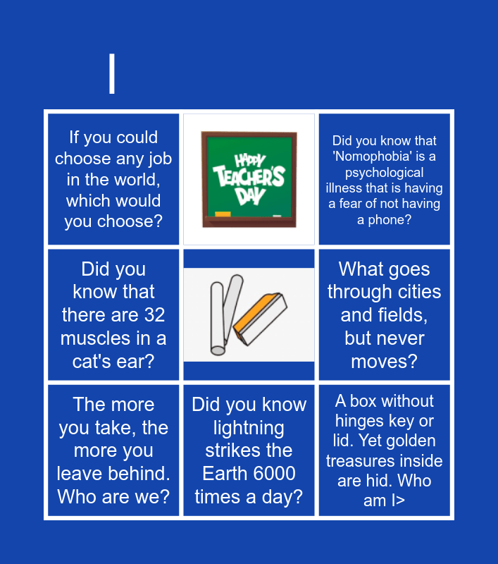 This bingo card has 2 images and 7 words: The more you take, the more you leave behind. Who are we?, Did you know that 'Nomophobia' is a psychological illness that is having a fear of not having a phone?, Did you know that there are 32 muscles in a cat's ear?, If you could choose any job in the world, which would you choose?, What goes through cities and fields, but never moves?, A box without hinges key or lid. Yet golden treasures inside are hid. Who am I> and Did you know lightning strikes the Earth 6000 times a day?.