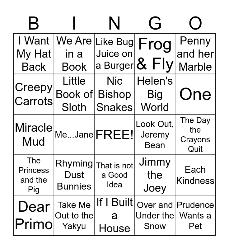 This bingo card has a free space and 24 words: Rhyming Dust Bunnies, Take Me Out to the Yakyu, Nic Bishop Snakes, Dear Primo, Penny and her Marble, I Want My Hat Back, Creepy Carrots, We Are in a Book, Look Out, Jeremy Bean, That is not a Good Idea, Helen's Big World, Miracle Mud, Jimmy the Joey, Each Kindness, Little Book of Sloth, Over and Under the Snow, The Day the Crayons Quit, Like Bug Juice on a Burger, One, Me...Jane, Prudence Wants a Pet, The Princess and the Pig, Frog & Fly and If I Built a House.