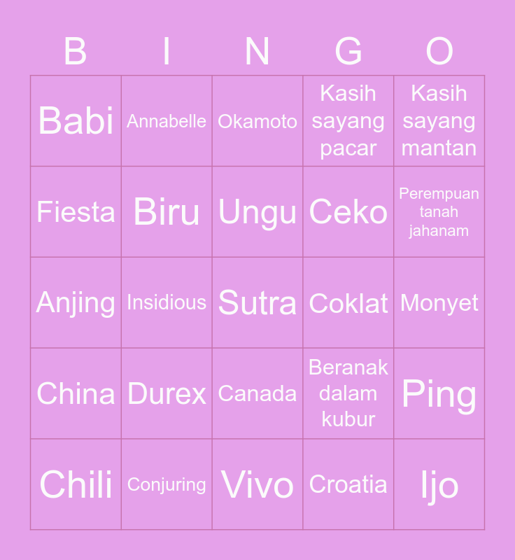 This bingo card has a free space and 24 words: Durex, Conjuring, Ungu, Chili, Kasih sayang mantan, Babi, Fiesta, Annabelle, Coklat, Canada, Ceko, Anjing, Beranak dalam kubur, Ping, Biru, Croatia, Monyet, Okamoto, Perempuan tanah jahanam, Insidious, Ijo, China, Kasih sayang pacar and Vivo.