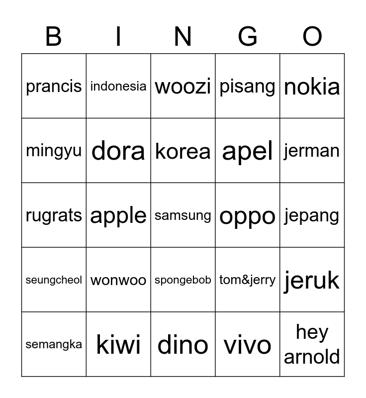 This bingo card has a free space and 24 words: wonwoo, kiwi, korea, semangka, nokia, prancis, mingyu, indonesia, oppo, spongebob, apel, rugrats, tom&jerry, jeruk, dora, vivo, jepang, woozi, jerman, apple, hey arnold, seungcheol, pisang and dino.