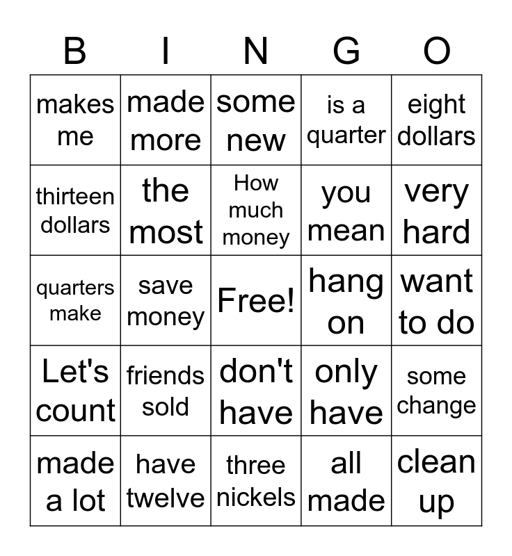 This bingo card has a free space and 24 words: friends sold, have twelve, How much money, made a lot, eight dollars, makes me, thirteen dollars, made more, hang on, don't have, you mean, quarters make, only have, some change, the most, all made, want to do, some new, very hard, save money, clean up, Let's count, is a quarter and three nickels.