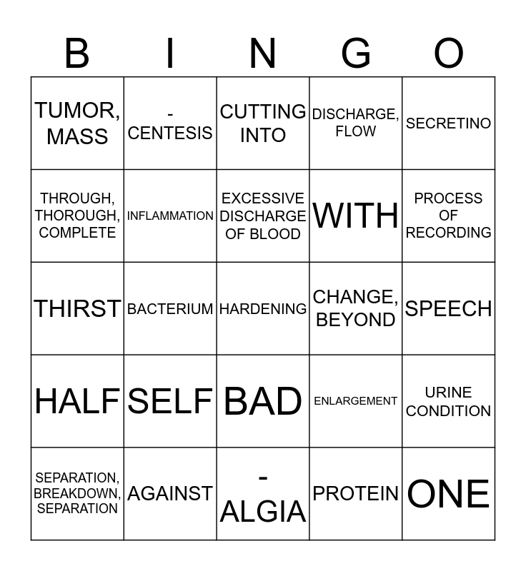 This bingo card has 25 words: SELF, -ALGIA, EXCESSIVE DISCHARGE OF BLOOD, SEPARATION, BREAKDOWN, SEPARATION, SECRETINO, TUMOR, MASS, THROUGH, THOROUGH, COMPLETE, -CENTESIS, CHANGE, BEYOND, BAD, WITH, THIRST, ENLARGEMENT, URINE CONDITION, INFLAMMATION, ONE, SPEECH, CUTTING INTO, PROCESS OF RECORDING, BACTERIUM, HARDENING, AGAINST, HALF, DISCHARGE, FLOW and PROTEIN.