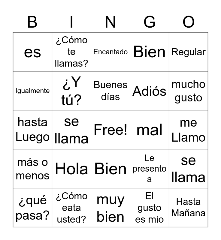 This bingo card has a free space and 24 words: Hola, ¿Cómo eata usted?, Buenes días, ¿qué pasa?, Regular, es, Igualmente, ¿Cómo te llamas?, mal, Bien, Adiós, hasta Luego, Le presento a, se llama, ¿Y tú?, El gusto es mio, me Llamo, Encantado, mucho gusto, se llama, Hasta Mañana, más o menos, Bien and muy bien.