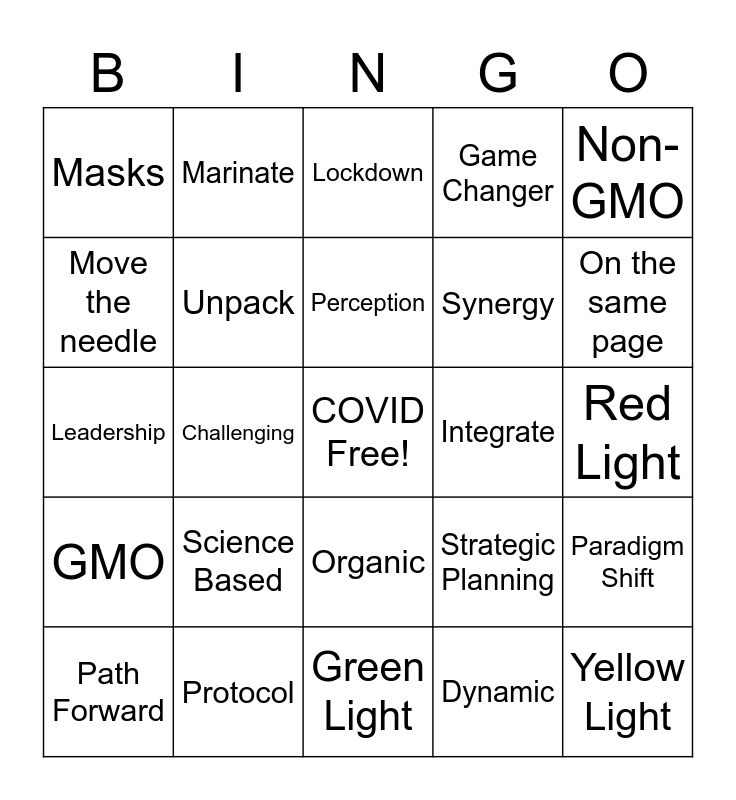 This bingo card has a free space and 29 words: Path Forward, Unprecedented, Challenging, Difficult, Masks, Lockdown, Unpack, Science Based, Integrate, Protocol, Red Light, Yellow Light, Green Light, Dynamic, On the same page, Overarching, Organic, GMO, Non-GMO, Leadership, Strategic Planning, Long Term Vision, Synergy, Move the needle, Game Changer, Marinate, Paradigm Shift, Perception and Stakeholder.