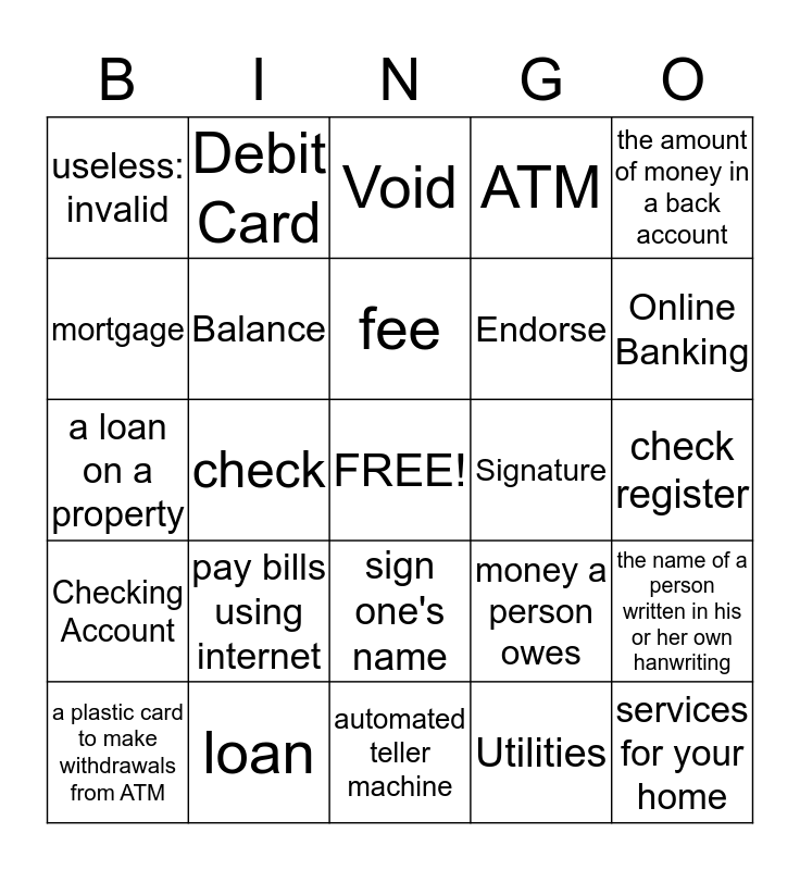 This bingo card has a free space and 24 words: pay bills using internet, loan, fee, a plastic card to make withdrawals from ATM, the amount of money in a back account, useless: invalid, mortgage, Debit Card, Signature, sign one's name, Endorse, a loan on a property, money a person owes, the name of a person written in his or her own hanwriting, Balance, Utilities, check register, Void, Online Banking, check, services for your home, Checking Account, ATM and automated teller machine.