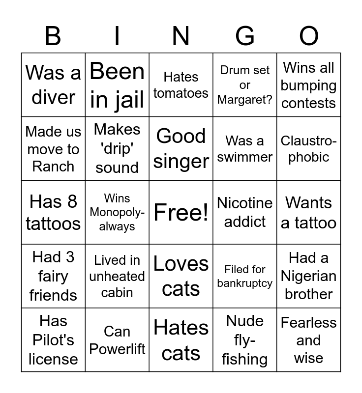 This bingo card has a free space and 34 words: Where's the Butter??, Nude fly-fishing, Has a wanky, Lived with ghosts, Had 3 fairy friends, Makes 'drip' sound, Wins all bumping contests, Has Pilot's license, Been in jail, Honor Roll Student, Good singer, Hates tomatoes, Born on Dad's bday, Loves olives, Nicotine addict, Claustro-phobic, Can Powerlift, Has 8 tattoos, Lived in unheated cabin, Filed for bankruptcy, Loves cats, Small but Mighty, Was a diver, Wants a tattoo, Hates cats, Fearless and wise, Drum set or Margaret?, Drum and bugle corp, Was a swimmer, Made us move to Ranch, Couldn't wait to leave Ranch, Wins Monopoly- always, Had a Nigerian brother and Can see dead people.