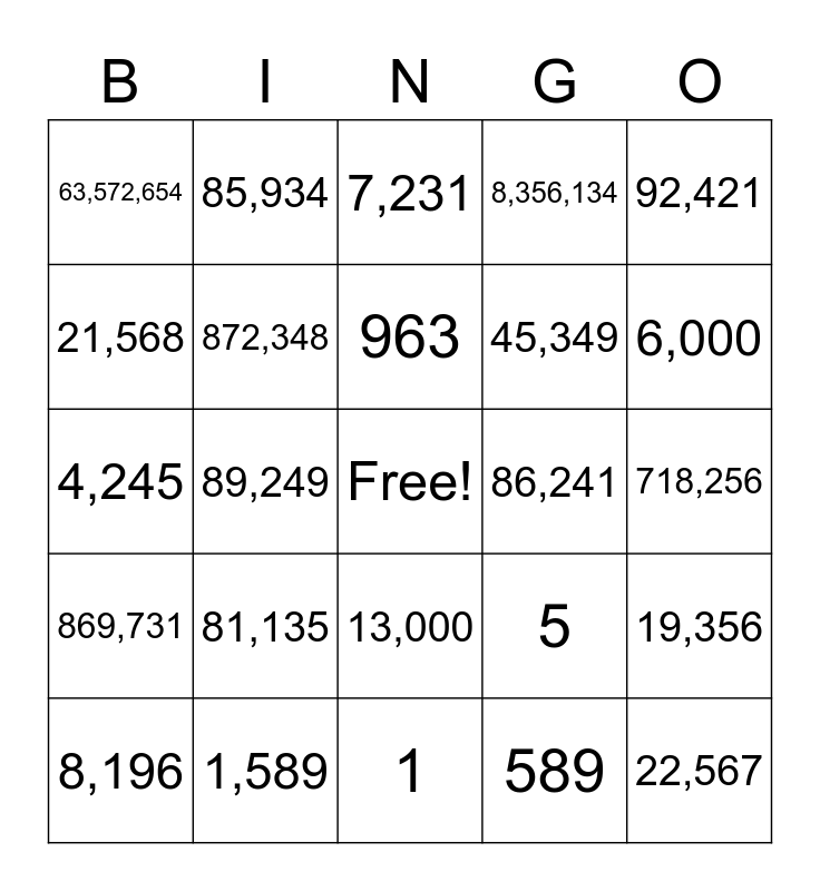 This bingo card has a free space and 59 words: 1,258,587, 1,589, 9,586,327, 869,731, 589, 9,657, 872,348, 372,984, 45,349, 2,567, 8,356,134, 63,579, 21,568, 34,678, 123,456, 63,572,654, 22,567, 92,421, 657, 963, 86,241, 7,231, 8,196, 19,356, 90,341, 6,324, 1,000,000, 40,000, 6,000, 300, 10, 100,000, 10,000, 45,672, 85,934, 67,231, 6, 89,249, 72,129, 4,245, 9,193, 81,135, 718,256, 76,246, 8,246, 12,000, 455,000, 48,123,988, 13,000, 1, I can understand math, I can do hard things, I am a great friend, I am a kind friend, There are so many people who love me, 5, 15, 150 and 1,500.