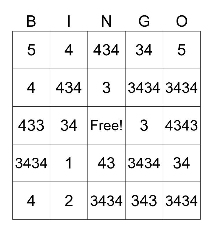 This bingo card has a free space and 24 words: 1, 2, 3, 4, 5, 5, 4, 4, 3, 43, 3434, 433, 3434, 34, 434, 343, 4343, 434, 3434, 34, 3434, 3434, 34 and 3434.