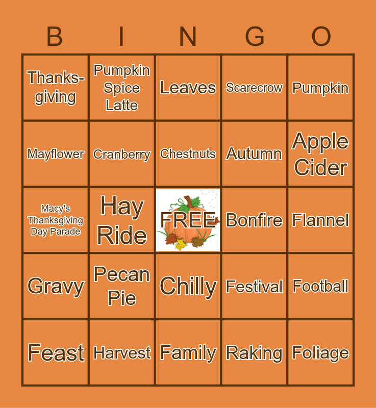 This bingo card has a free space and 69 words: Haunted House, Flannel, Cranberry Sauce, Squash, Harvest, Costumes, Scarecrow, Turkey, Pumpkin, Wind, Football, Pie, Thanks-giving, Leaves, Mittens, Hay Ride, Chilly, Autumn, November, Gravy, Bonfire, Festival, Apple Cider, Hay Bale Maze, Pumpkin Patch, Jack-O-Lantern, Apple Picking, Cardigan, Raking, PILGRIMS, Pumpkin Spice Latte, October, Brisk, Cozy, Food, Blustery, Stars, Giving Thanks, Mayflower, Stuffing, Pecan Pie, Foliage, Trick-or-Treat, Baking, Gobble Gobble, Feast, Gourds, Halloween, Sweater, Cranberry, Chestnuts, New School Supplies, Corn Maze, Family, Scarves, Holiday, Black Friday, Hibernate, Pumpkin Pie, Macy's Thanksgiving Day Parade, Fog, CAMPFIRE, Turkey, Hot Cocoa, Tobagan, Movies, Hiking, Cinnamon Pine Cones and Leaf Blowing.