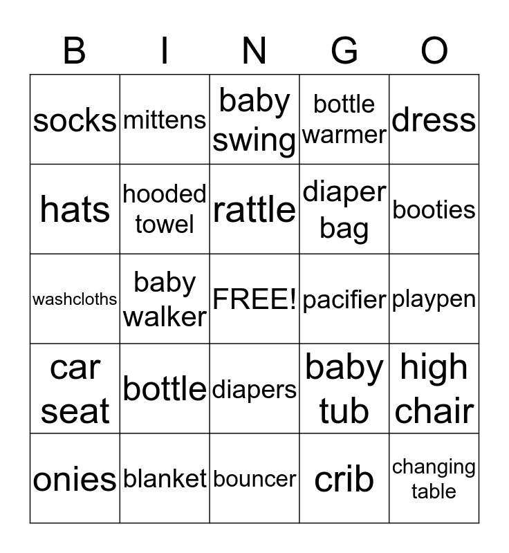 This bingo card has a free space and 24 words: bottle, blanket, rattle, onies, dress, socks, hats, mittens, pacifier, diapers, diaper bag, washcloths, baby tub, high chair, hooded towel, crib, playpen, baby swing, booties, baby walker, changing table, car seat, bottle warmer and bouncer.