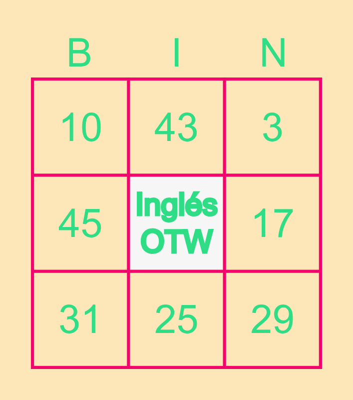 This bingo card has a free space and 17 words: 1, 8, 3, 10, 15, 17, 22, 25, 29, 31, 34, 38, 45, 43, 40, 55 and 56.