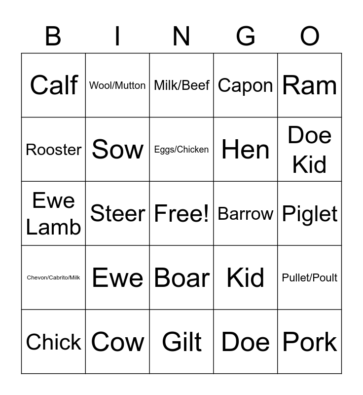 This bingo card has a free space and 30 words: Cow, Bull, Steer, Heifer, Calf, Milk/Beef, Sow, Boar, Barrow, Gilt, Piglet, Pork, Doe, Buck, Doe Kid, Wether (Goat), Kid, Chevon/Cabrito/Milk, Ewe, Ram, Ewe Lamb, Wether (Sheep), Wool/Mutton, Hen, Rooster, Capon, Pullet/Poult, Chick, Eggs/Chicken and lamb.
