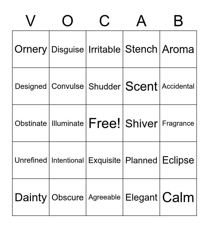This bingo card has a free space and 24 words: Intentional, Obscure, Shudder, Dainty, Aroma, Ornery, Designed, Disguise, Shiver, Exquisite, Scent, Obstinate, Planned, Eclipse, Convulse, Elegant, Fragrance, Irritable, Accidental, Illuminate, Calm, Unrefined, Stench and Agreeable.