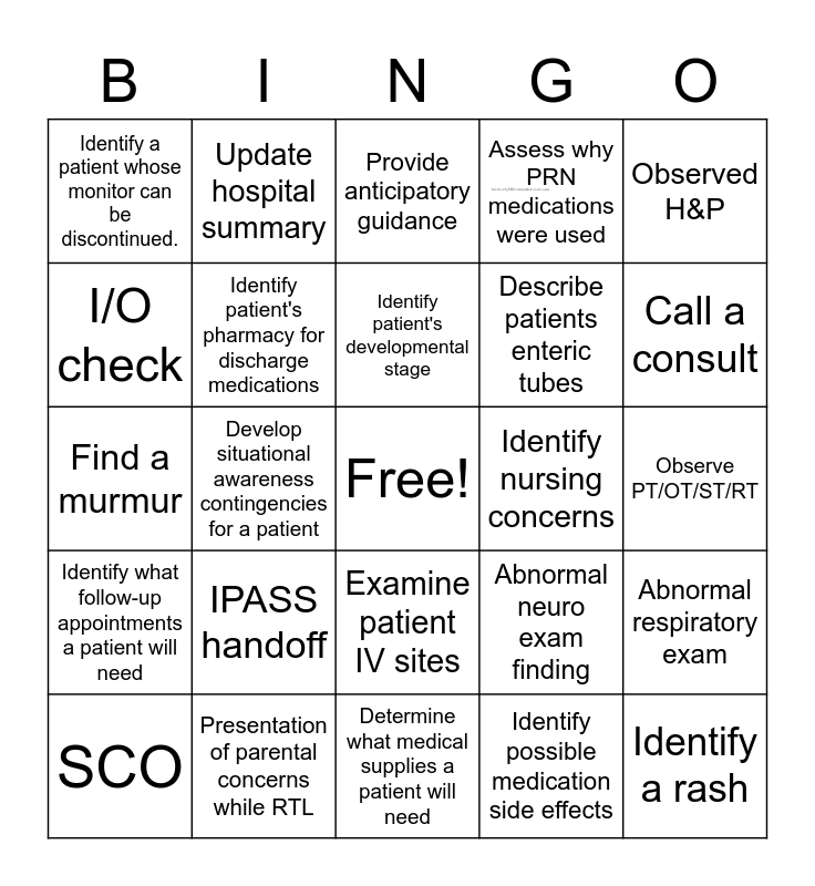 This bingo card has 1 images, a free space and 24 words: IPASS handoff, Presentation of parental concerns while RTL, Identify patient's developmental stage, SCO, Observed H&P, Identify a patient whose monitor can be discontinued., I/O check, Update hospital summary, Identify nursing concerns, Examine patient IV sites, Describe patients enteric tubes, Find a murmur, Abnormal neuro exam finding, Abnormal respiratory exam, Identify patient's pharmacy for discharge medications, Identify possible medication side effects, Observe PT/OT/ST/RT, Provide anticipatory guidance, Call a consult, Develop situational awareness contingencies for a patient, Identify a rash, Identify what follow-up appointments a patient will need, Assess why PRN medications were used and Determine what medical supplies a patient will need.