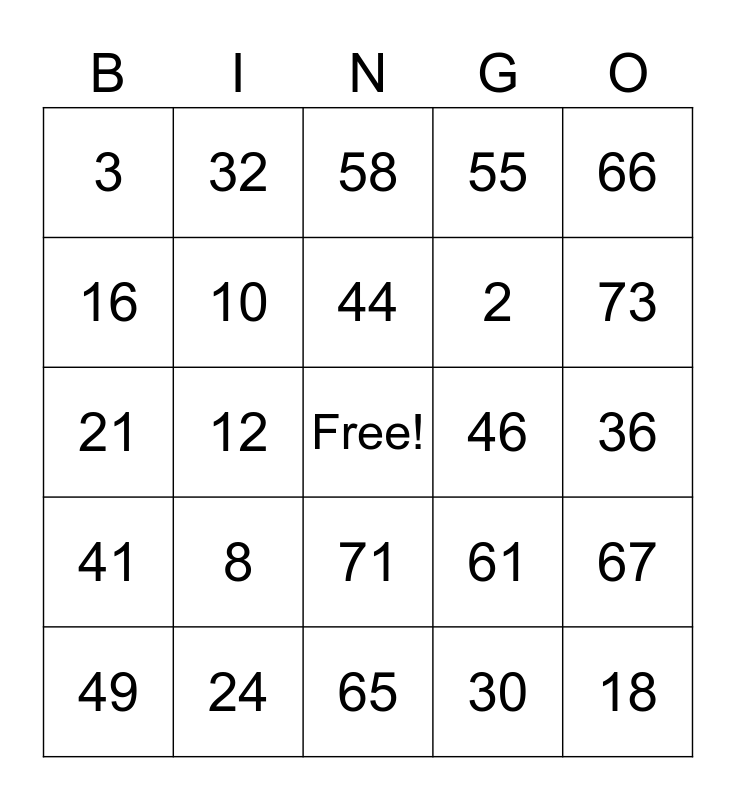 This bingo card has a free space and 24 words: 8, 24, 44, 49, 66, 3, 16, 32, 46, 71, 2, 21, 61, 67, 10, 30, 36, 58, 73, 12, 18, 41, 55 and 65.