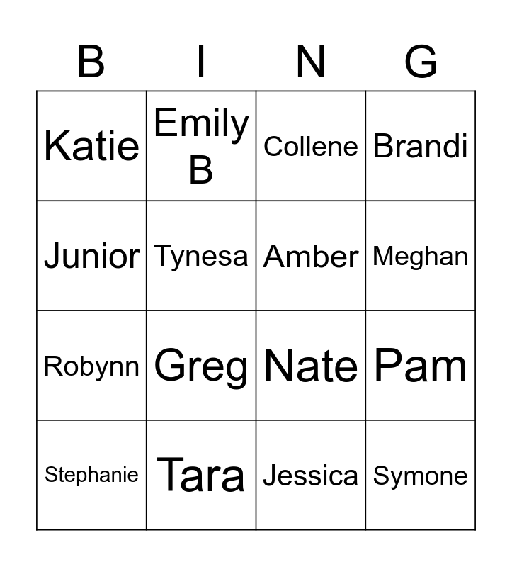 This bingo card has 21 words: Tara, Emily F, Emily B, Jesse, Jessica, Amber, Katie, Collene, Nate, Meghan, Robynn, Brandi, Symone, Lindsay, Tynesa, Rebecca, Stephanie, Greg, Junior, Pam and Vaneza.