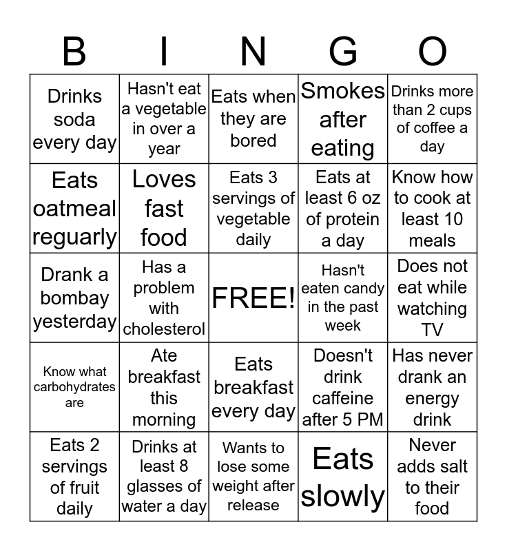 This bingo card has a free space and 24 words: Ate breakfast this morning, Drinks at least 8 glasses of water a day, Eats 3 servings of vegetable daily, Eats 2 servings of fruit daily, Drinks more than 2 cups of coffee a day, Drinks soda every day, Eats oatmeal reguarly, Hasn't eat a vegetable in over a year, Hasn't eaten candy in the past week, Eats breakfast every day, Eats at least 6 oz of protein a day, Drank a bombay yesterday, Doesn't drink caffeine after 5 PM, Has never drank an energy drink, Loves fast food, Eats slowly, Does not eat while watching TV, Eats when they are bored, Know how to cook at least 10 meals, Has a problem with cholesterol, Never adds salt to their food, Know what carbohydrates are, Smokes after eating and Wants to lose some weight after release.