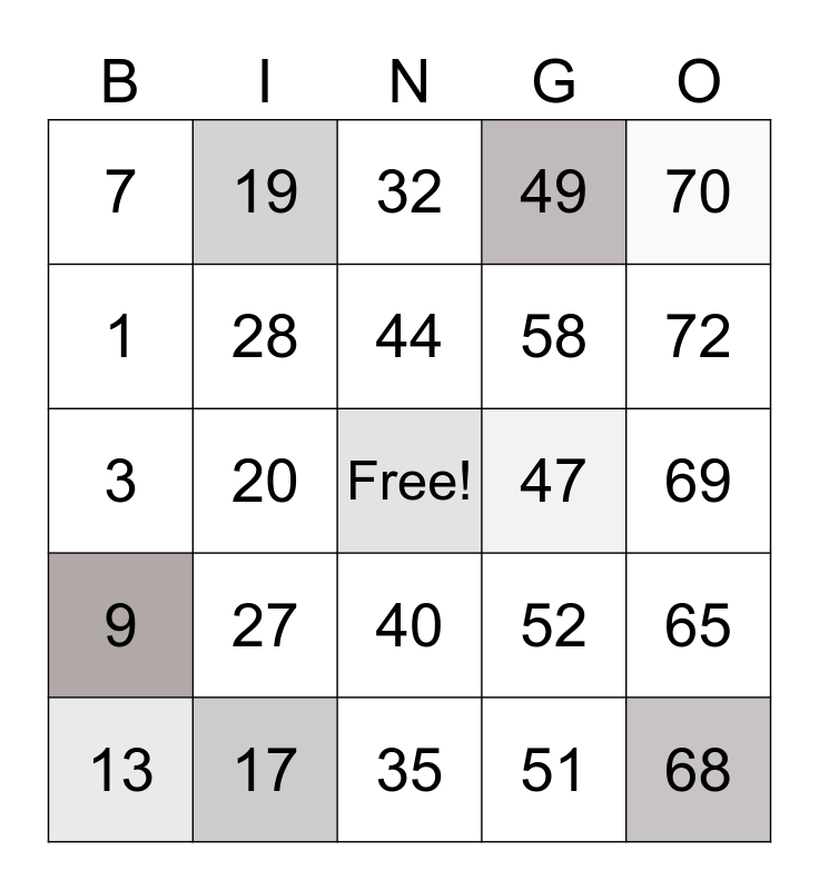 This bingo card has a free space and 24 words: 13, 27, 44, 51, 70, 7, 19, 32, 47, 69, 3, 28, 52, 65, 1, 17, 35, 49, 72, 9, 20, 40, 58 and 68.