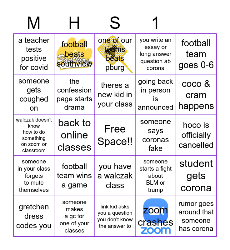 This bingo card has 3 images, a free space and 24 words: football team wins a game, someone makes a gc for one of your classes, theres a new kid in your class, gretchen dress codes you, football team goes 0-6, a teacher tests positive for covid, someone gets coughed on, football beats southview, someone says coronas fake, you have a walczak class, going back in person is announced, walczak doesn't know how to do something on zoom or classroom, someone starts a fight about BLM or trump, student gets corona, the confession page starts drama, zoom crashes, hoco is officially cancelled, one of our teams beats pburg, coco & cram happens, back to online classes, rumor goes around that someone has corona, someone in your class forgets to mute themselves, you write an essay or long answer question ab corona and link kid asks you a question you don't know the answer to.