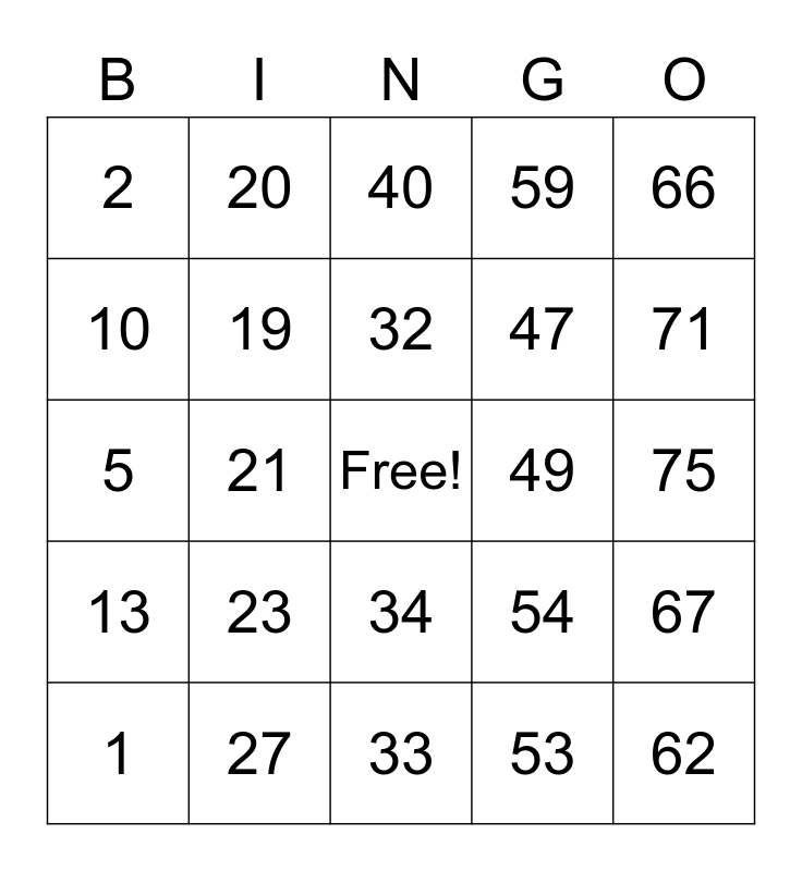 This bingo card has a free space and 24 words: 1, 23, 32, 53, 66, 2, 20, 40, 49, 75, 5, 19, 54, 67, 10, 27, 33, 59, 71, 13, 21, 34, 47 and 62.