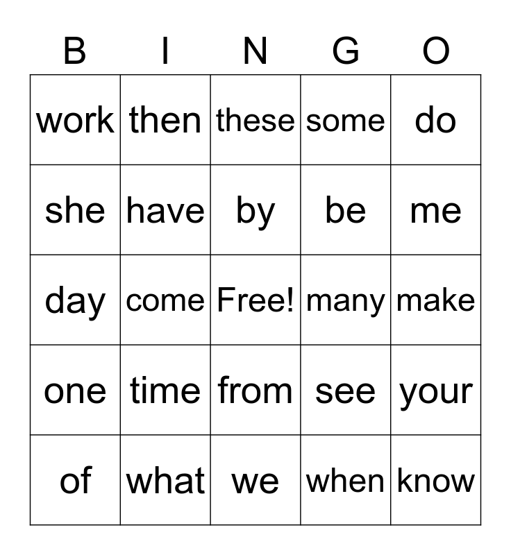 This bingo card has a free space and 39 words: or, for, more, have, of, from, by, my, do, one, come, some, know, make, many, time, how, work, said, see, she, we, be, me, go, so, you, that, they, then, them, this, these, what, when, with, your, day and he.